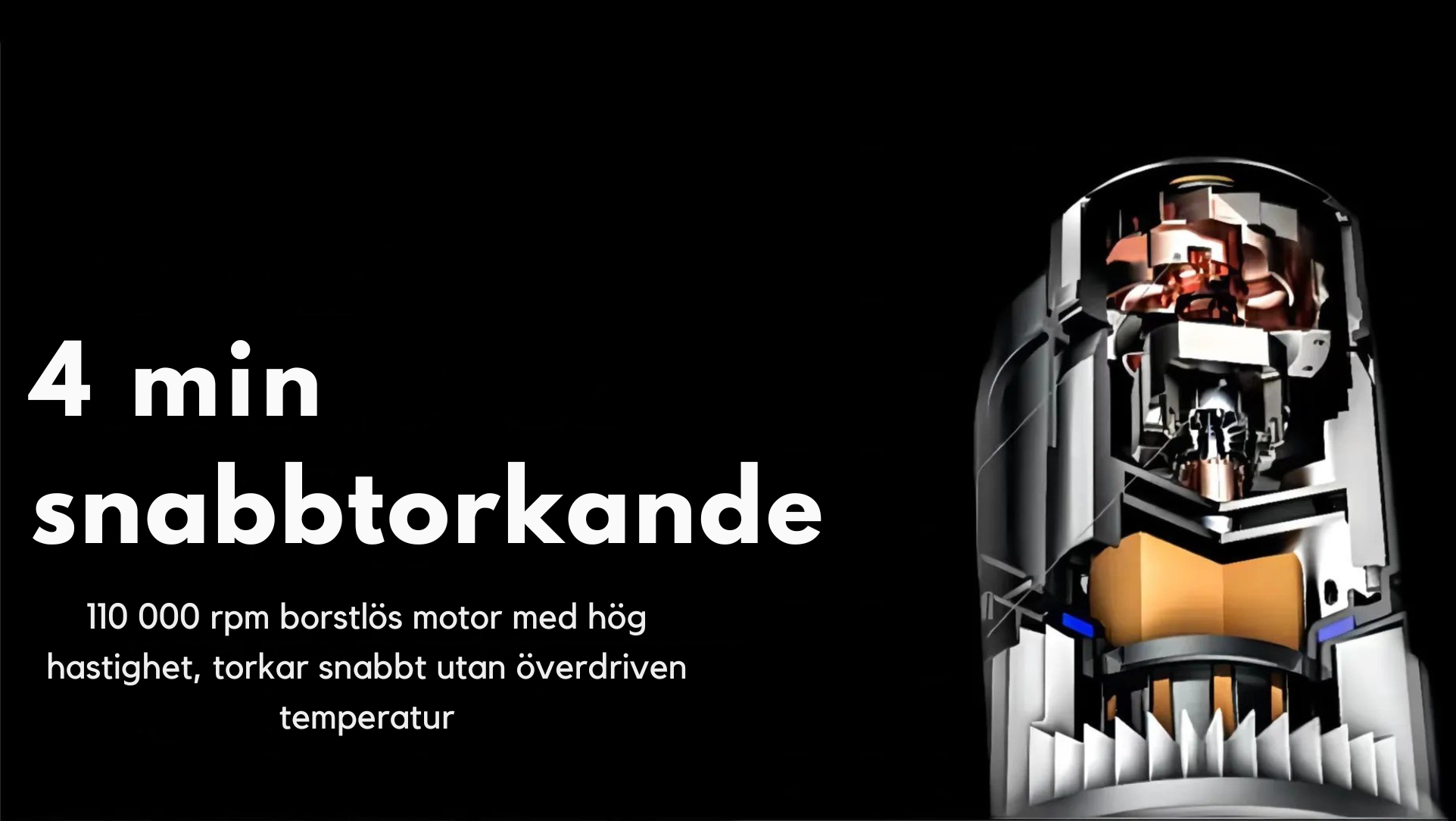 Luftflödet är förbättrat för att ge en kontrollerad, höghastighets luftstråle för snabb torkning.